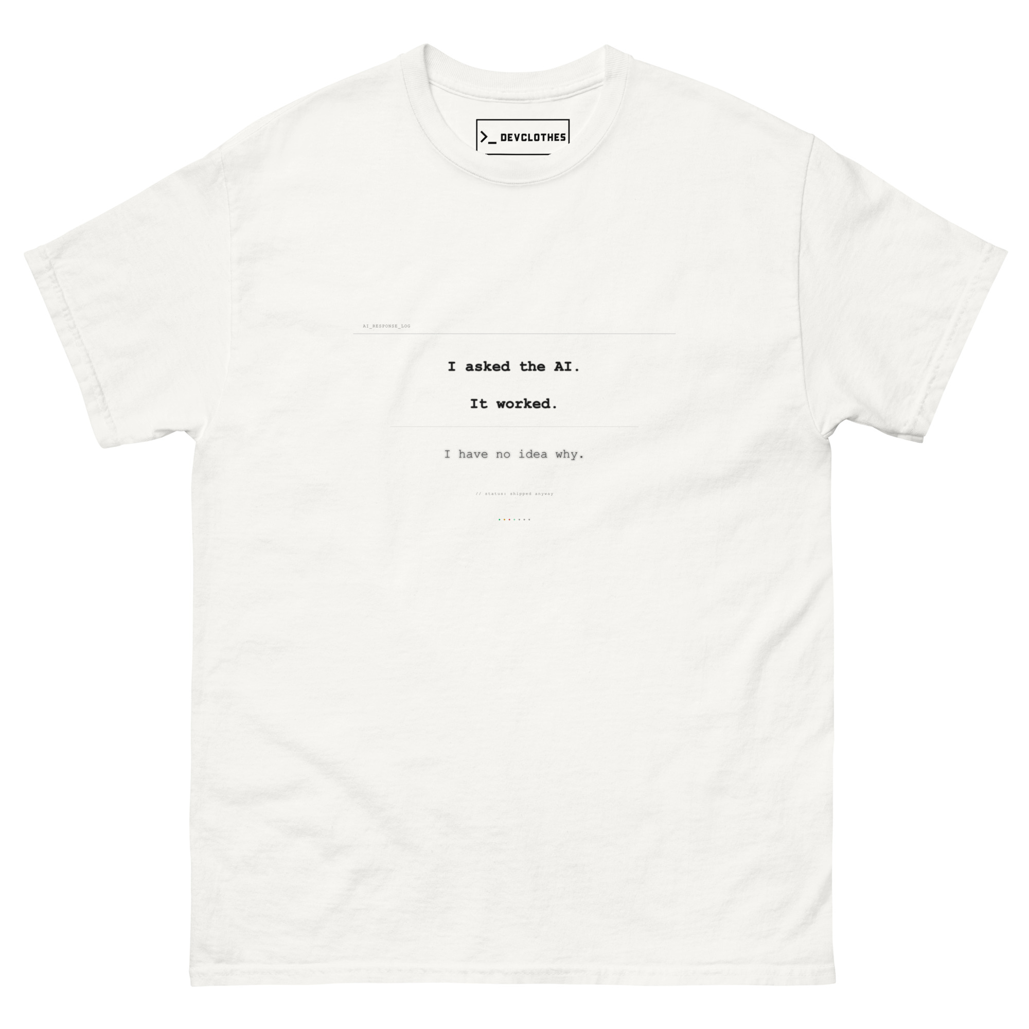 This tee captures the defining developer experience of our era: letting AI write your code and hoping for the best. Featuring a terminal-style log aesthetic with status indicators, it’s the honest confession every Copilot, Cursor, and Claude Code user needs on their chest. Made for developers who’ve shipped code they can’t fully explain — so, all of us.